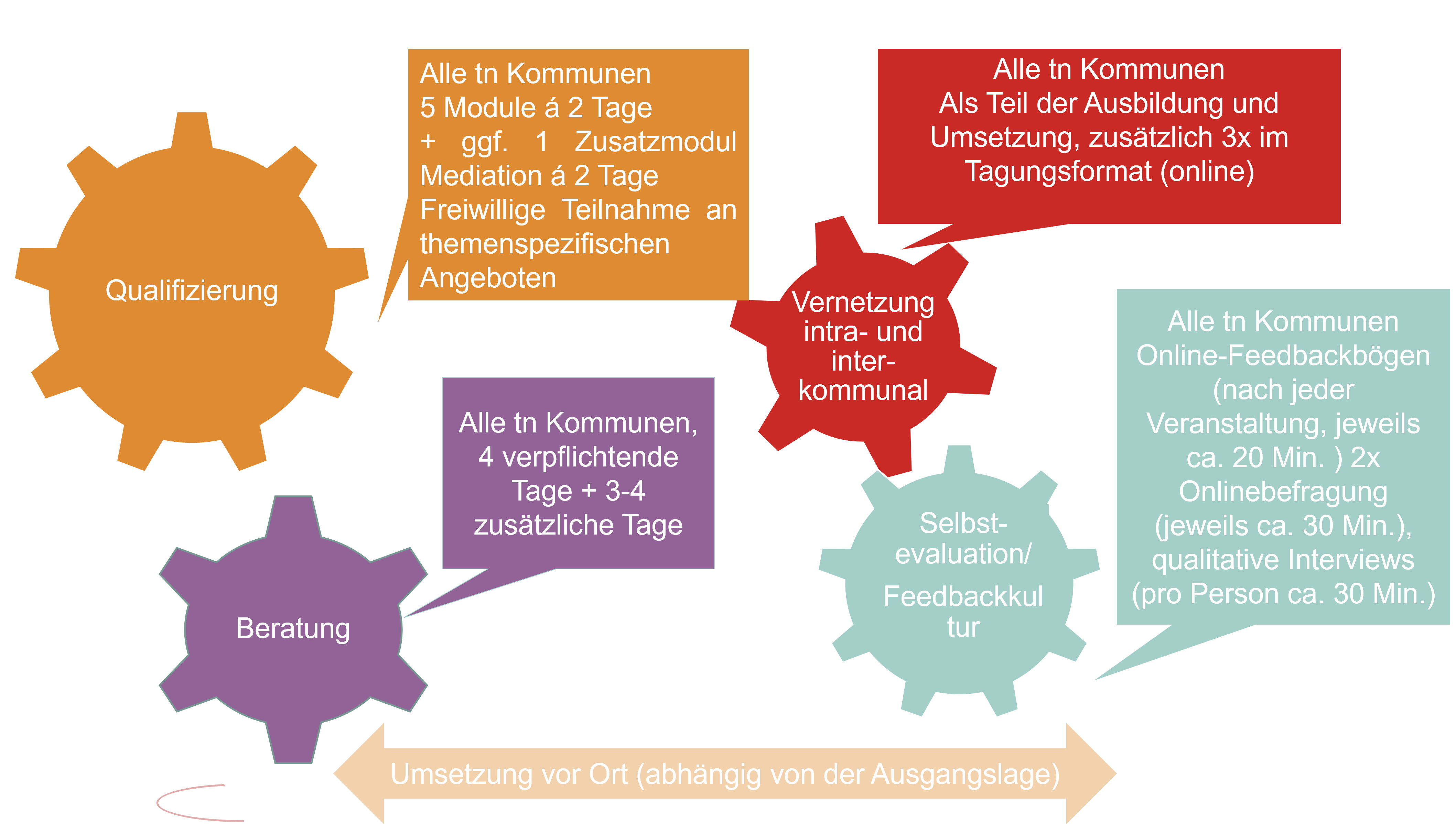 Im Zentrum des Projekts steht darüber hinaus eine von der Hochschule Niederrhein zertifizierte Fortbildung in fünf Modulen, die Mitarbeiter:innen der Kommunalen Verwaltung zu Konfliktmanager:innen ausbildet. Sie werden befähigt und unterstützt, ein lokal passgenaues Konfliktmanagement-System für ihre Kommune zu entwickeln. Hier geht es darum, eine konstruktive Umgangsweise mit Konflikten zu erarbeiten und ein Netzwerk zu etablieren, das im Krisenfall agieren kann. Die wissenschaftliche Begleitung des Prozesses wird Hinweise auf mögliche Hindernisse und Gelingungsfaktoren geben, die auch für andere Kommunen hilfreich sein können.